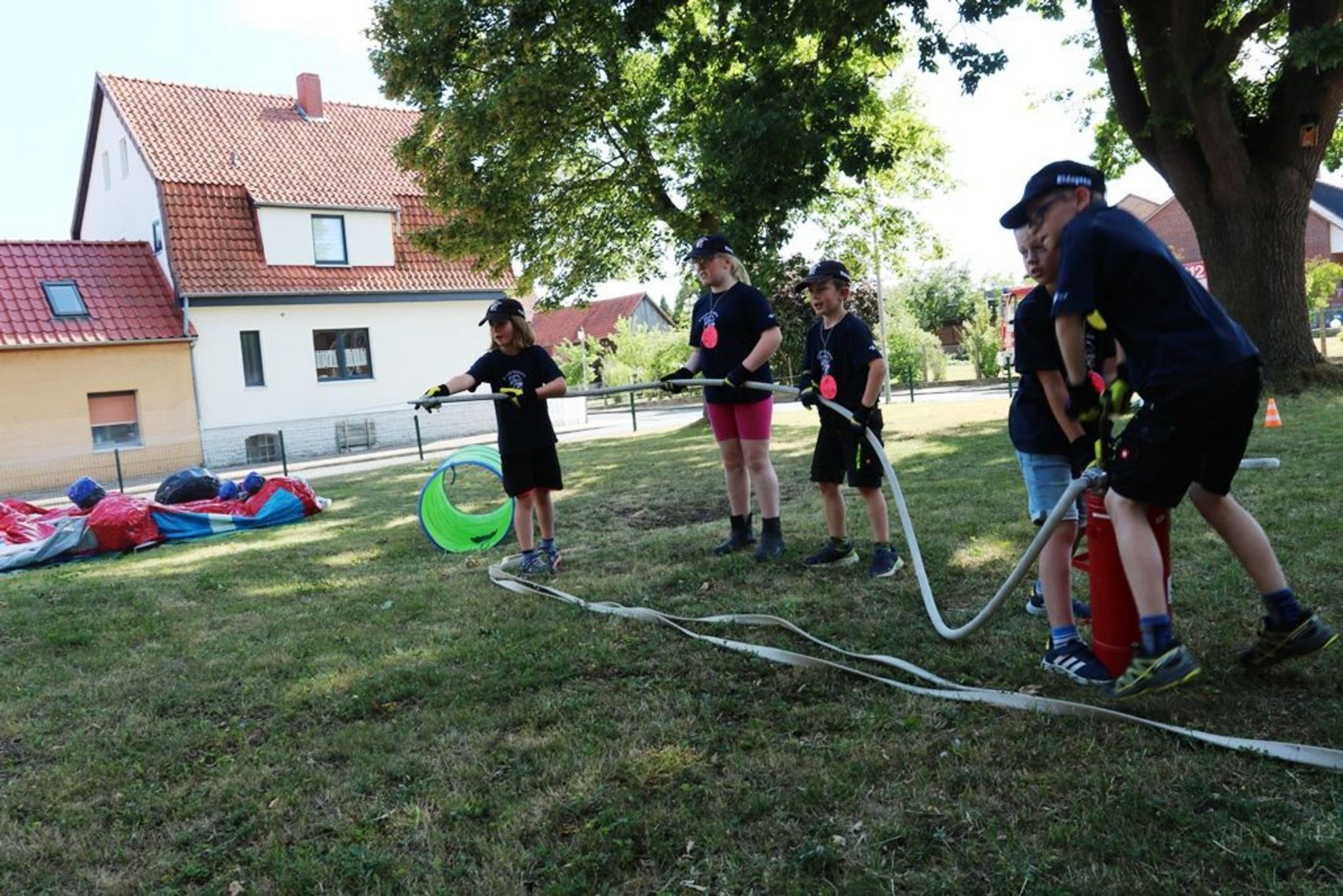 Die Jüngsten zeigten ebenfalls den sicheren Umgang mit dem Feuer und erklärten beim Anzünden einer Kerze, worauf zu achten ist. Abschließend galt es in kleinen Gruppen Hindernisse zu überwinden und nach dem Ausrollen von D-Schläuchen mit der Kübelspritze ein „Feuer“ zu löschen. 11 Kinder können nun mit vollem Stolz das Kinderflammen-Abzeichen 1 und 2, sowie 8 Kinder die Abzeichen 3 und 4 tragen. Ein Kind hat bereits im Vorfeld alle Ausbildungsnachweise erlangt und durfte eine extra Prüfung ablegen. Aufgrund des Alters wurden nach der Flammen-Abnahme 7 Kinder in die Jugendfeuerwehr, der nächsten Abteilung nach der Kinderfeuerwehr, übergeben. Die tollen Leistungen feierten die Feuermäuse mit ihren Familien bei einem anschließenden Grillfest. Die Feuerwehr-Hüpfburg war eine großartige Überraschung für die Kinder. Die Feuermäuse legen nun eine Sommerpause ein und freuen sich nach den Ferien auf viele spannende Dienste und Aktivitäten.