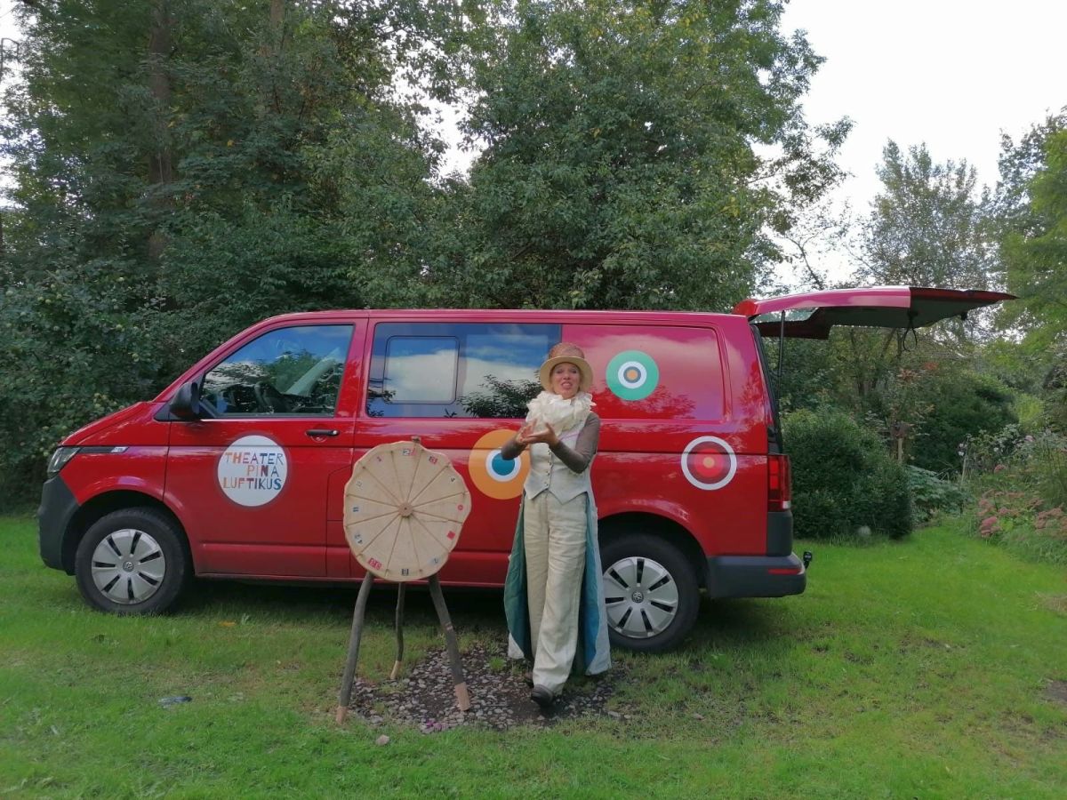 Springe. Die Schauspielerin Petra Jaeschke vom Theater Pina Luftikus kommt mit ihrem kirschroten Bus und einem Glücksrad voller toller Gedichte und Geschichten, Konfetti und einer Schatzkiste und Steinen von der Nordseeküste und Zungenbrechern von quietschnassen Quabbelquallen und zwanzig zerquetschten Zwetschgen, ihrem Lieblingsbuch und bekannten Liedern. .