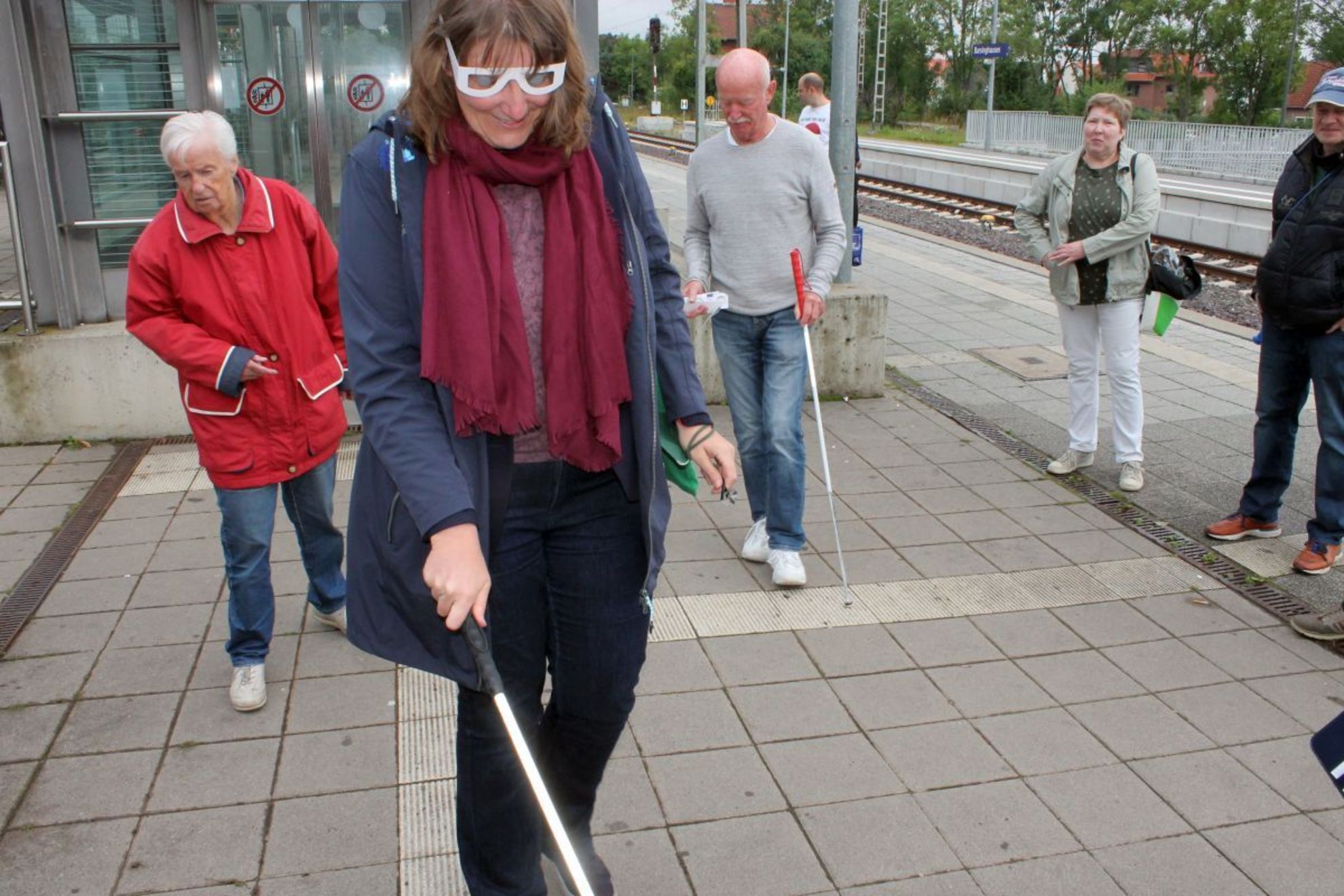 Am Barsinghäuser Bahnhof wurde der Fahrstuhl begutachtet. Dieser ist, wieder einmal, defekt. Dies wurde nicht nur von den Grünen, sondern auch von den Behindertenbeauftragten der Stadt Nicole Letsch und Claudia Pannki sowie Mitgliedern des Seniorenrates kritisiert, die am Spaziergang teilnahmen. Aufgrund des defekten Fahrstuhls seien große Umwege zum Bahngleis, oder in die Nordstadt nötig. „Die Bahn sieht Menschen mit Beeinträchtigungen oft als Last, nicht als Kunden“, bedauerte Europaabgeordnete Langensiepen. Sind die wenigen Rollstühle oder Umsteigehilfen ausgebucht, könnten Menschen mit Beeinträchtigungen schlicht nicht an diesen Tagen mit der Bahn reisen. Seien die Behinderten-WCs im Zug defekt, dürfte die Bahn die Menschen nicht mitnehmen. „Da sieht die Bahn leider nur die Verspätungen durch Menschen mit Beeinträchtigungen“, so Langensiepen. Auch das Leitsystem für Sehbehinderte, könnte noch verbessert werden. Aus dem Seniorenrat wurde die Neigung des Zugangs zum Bahnhof für Rollstuhlfahrer kritisch gesehen. Mit Blindenstöcken und Brillen, die Sehschwächen simulierten, konnten die Teilnehmer „Stolperfallen“ selbst erfahren.
