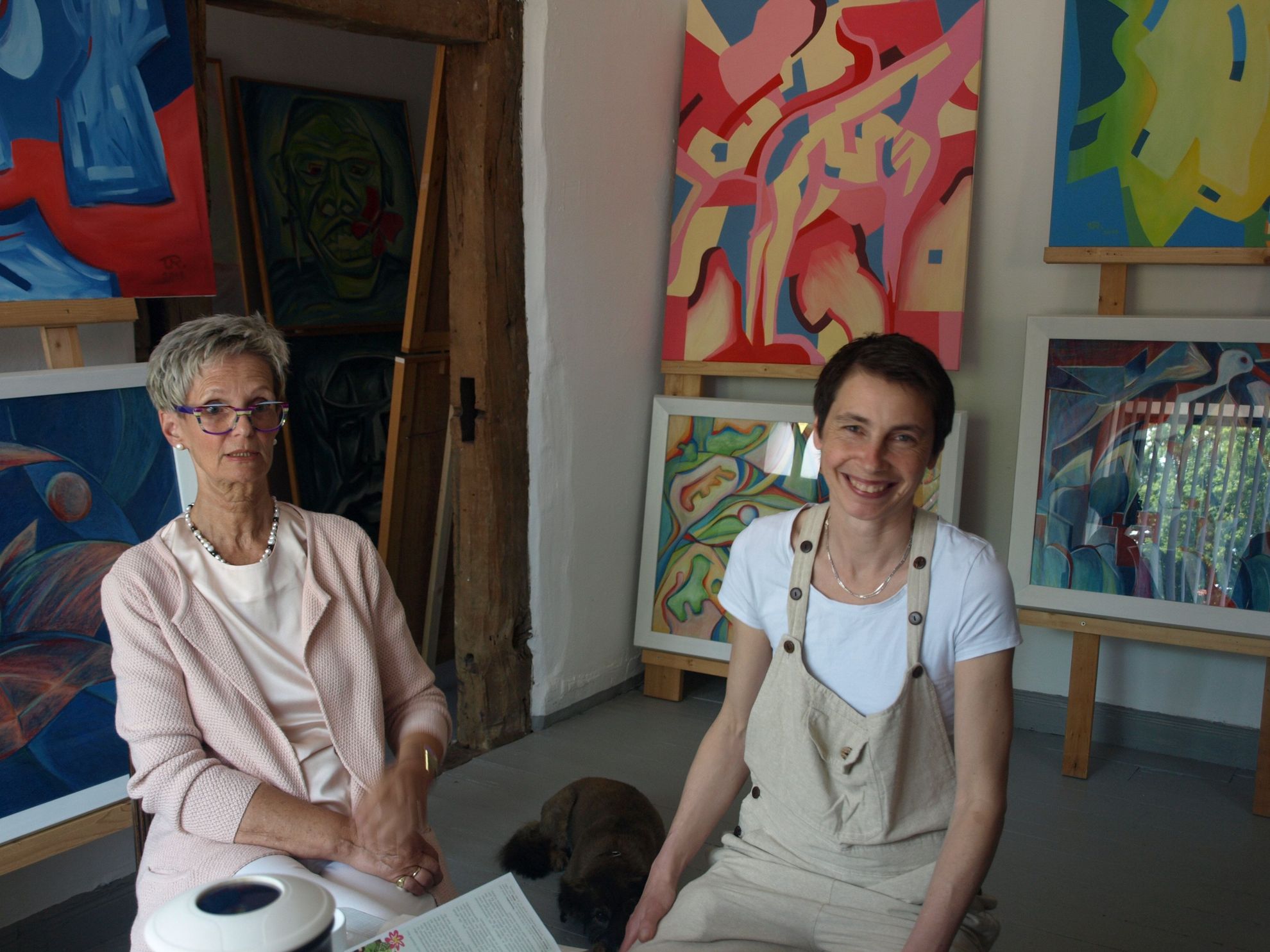 Künstlerin und Kunstspur-Organisatorin Stefanie Rogge im Gespräch mit "Maler" Ulf Rausche in seinem Atelier am Feuerwehrplatz 12 (ehem. Bäckerei Luebkemann).