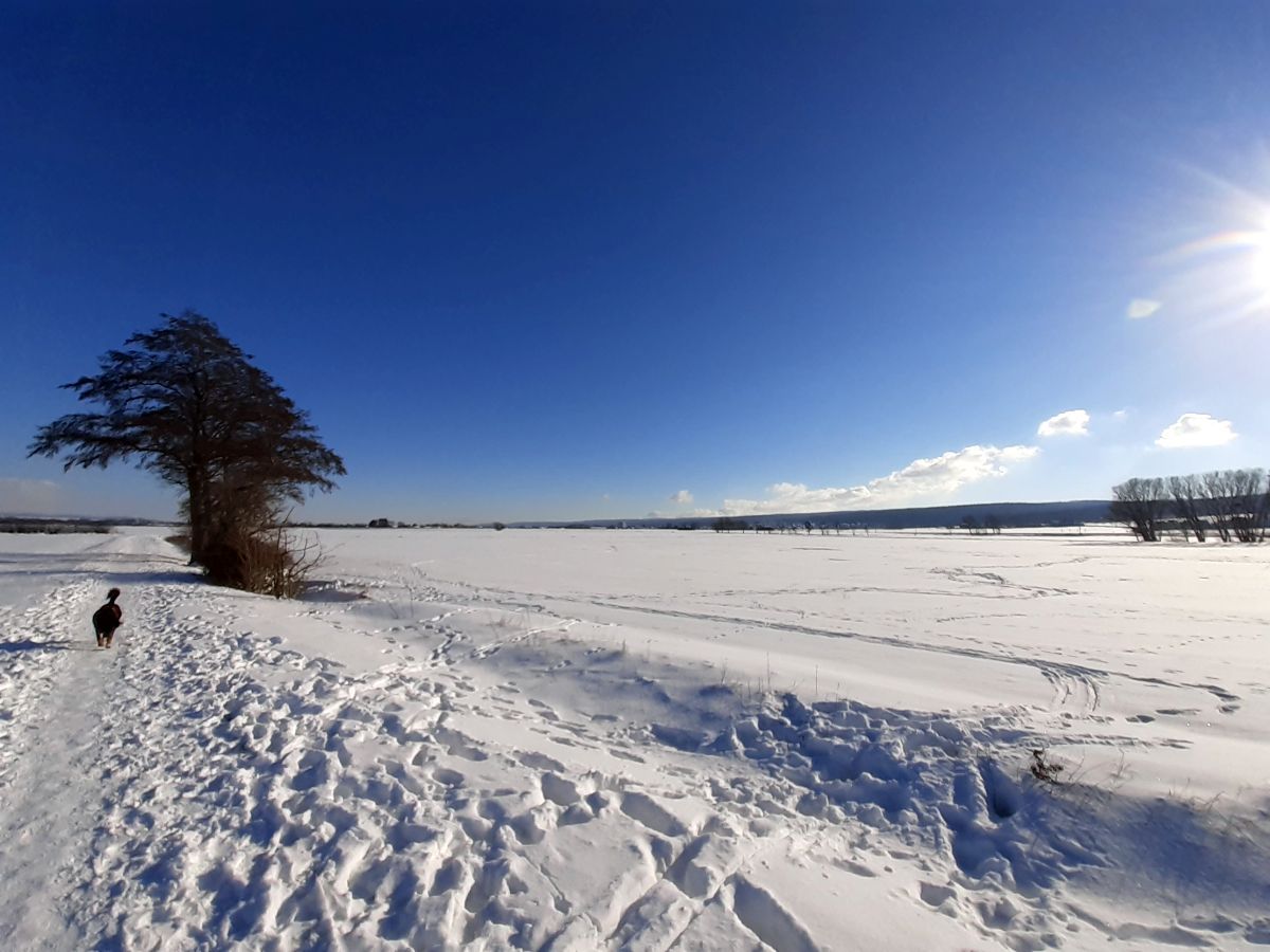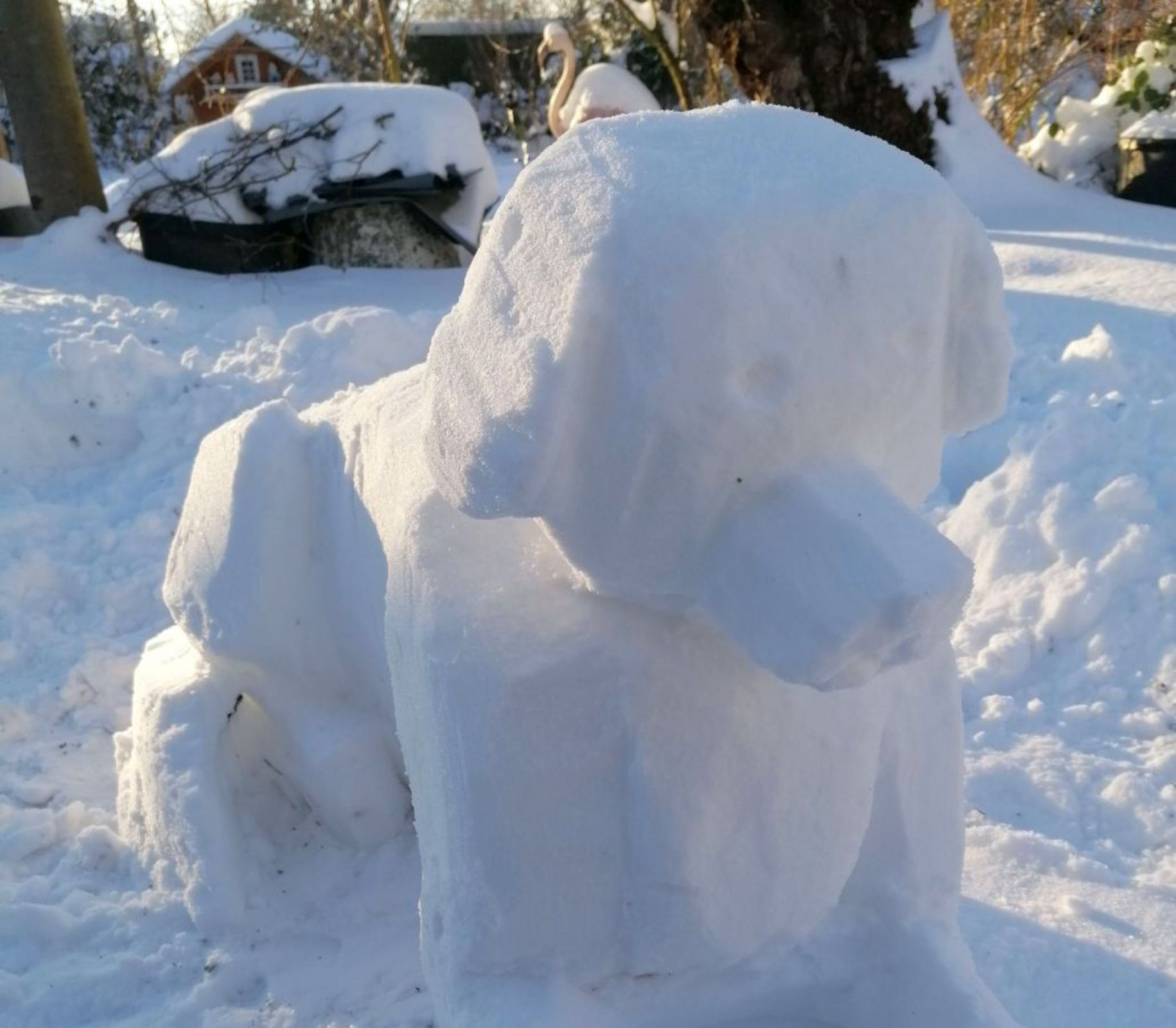 Für Andrea Runge war ein normaler Schneemann zu langweilig und es musste etwas Neues ausprobiert werden. Ob sich der „Hausherr“ Wotan über die zusätzlichen vier Pfoten gefreut hat? Solange die vier Schneepfoten nicht mit auf das warme Sofa dürfen sollte die Konkurrenz aus Schnee für den kleinen Rüden Wotan aber willkommen sein.