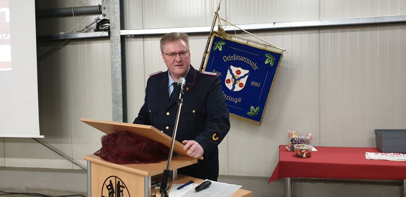 Zugführer Björn Bieniek berichtet über diverse Aktivitäten, wie zum Beispiel den Besuch einer Übungsanlage mit der Möglichkeit der theoretischen und praktischen Ausbildung. Geübt wurde die Menschenrettung aus einem brennenden, 600 bis 700 Grad heißem, Raum. Die Möglichkeit dieser Ausbildung sei dem Förderverein zu verdanken.