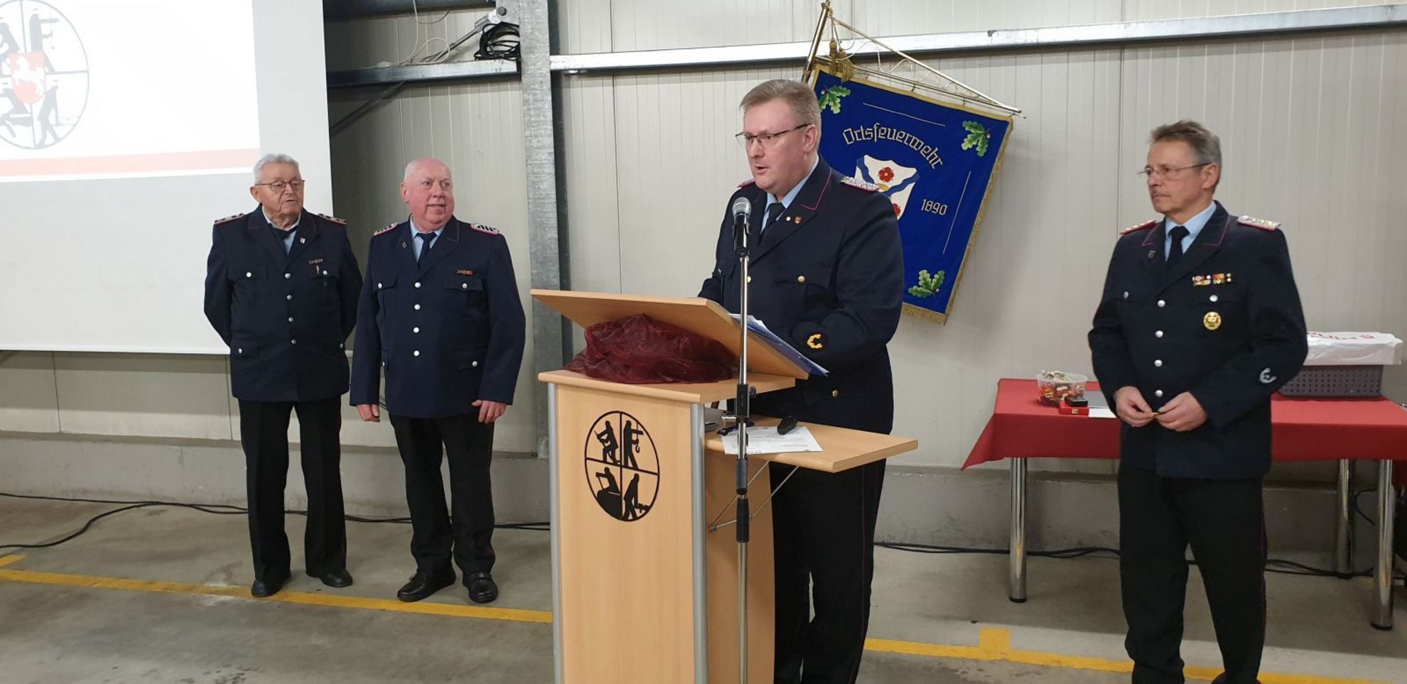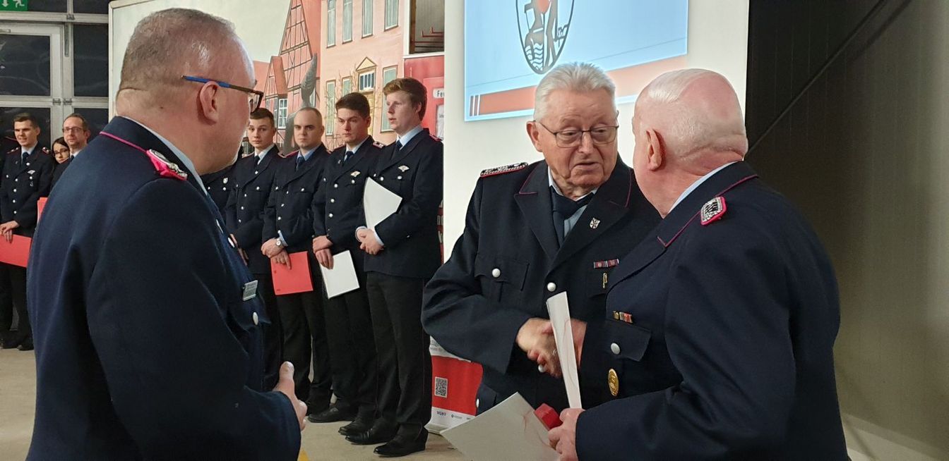 Abzeichen des Landesfeuerwehrverbandes Niedersachsen für langjährige Mitgliedschaft nahmen Feuerwehrmusiker Thomas Behrens (25 Jahre), Oberfeuerwehrmann Helmut Kruse (50 Jahre) und Oberlöschmeister Georg Christoffer (60 Jahre) entgegen.
