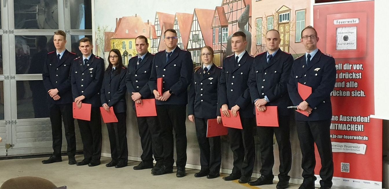 Befördert wurden Jonas Baxmann und Maralen Ponitka zum Feuerwehrmann, Gerret Semisch und Alexander Storm zum Oberfeuerwehrmann, Christian Ahrens, Sandra Kaehler und Christopher Koch zum Hauptfeuerwehrmann sowie Björn Bieniek zum Brandmeister.