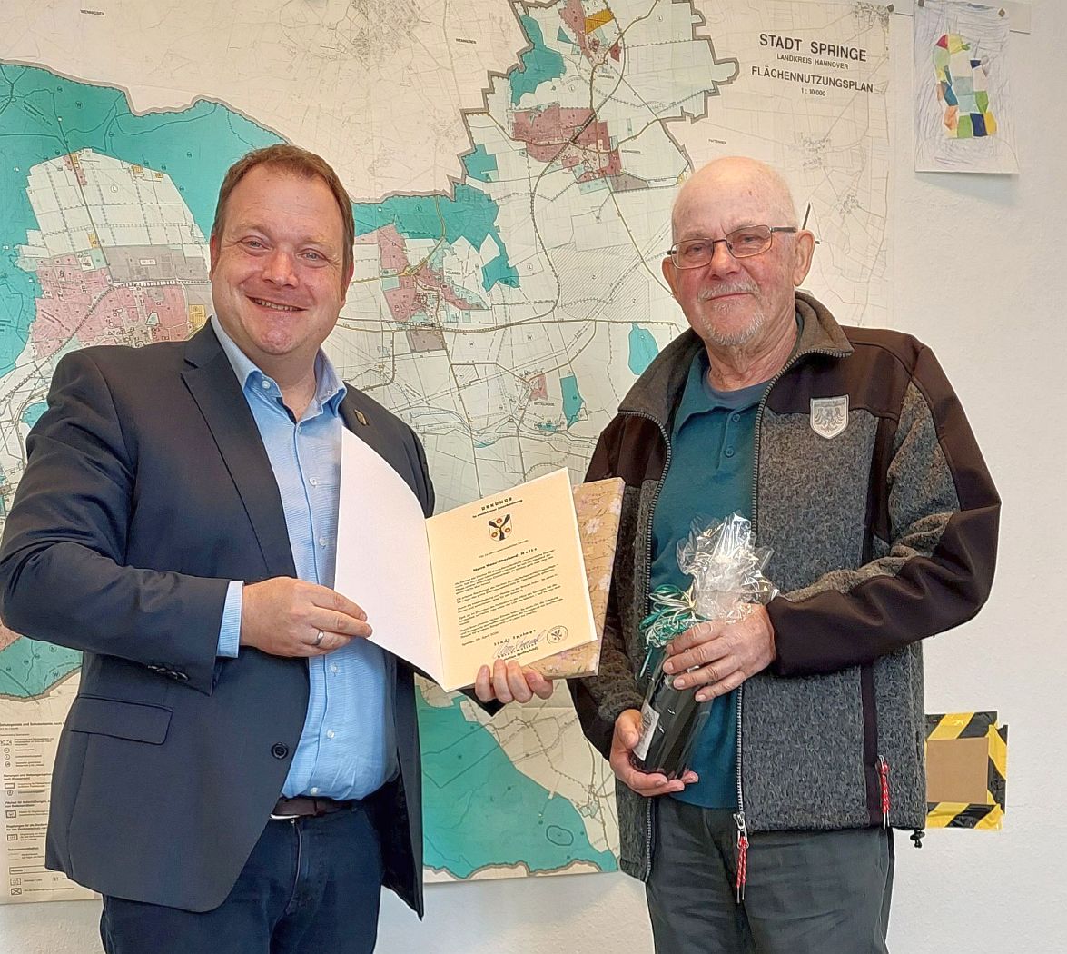 Springe. Im April 2026 würdigte Bürgermeister Christian Springfeld das außergewöhnliche ehrenamtliche Engagement von Hans-Eberhard Nolte: Seit 23 Jahren setzt er sich unermüdlich für die Pflege einer öffentlichen Grünanlage im Ortsteil Altenhagen I der Stadt Springe ein.
