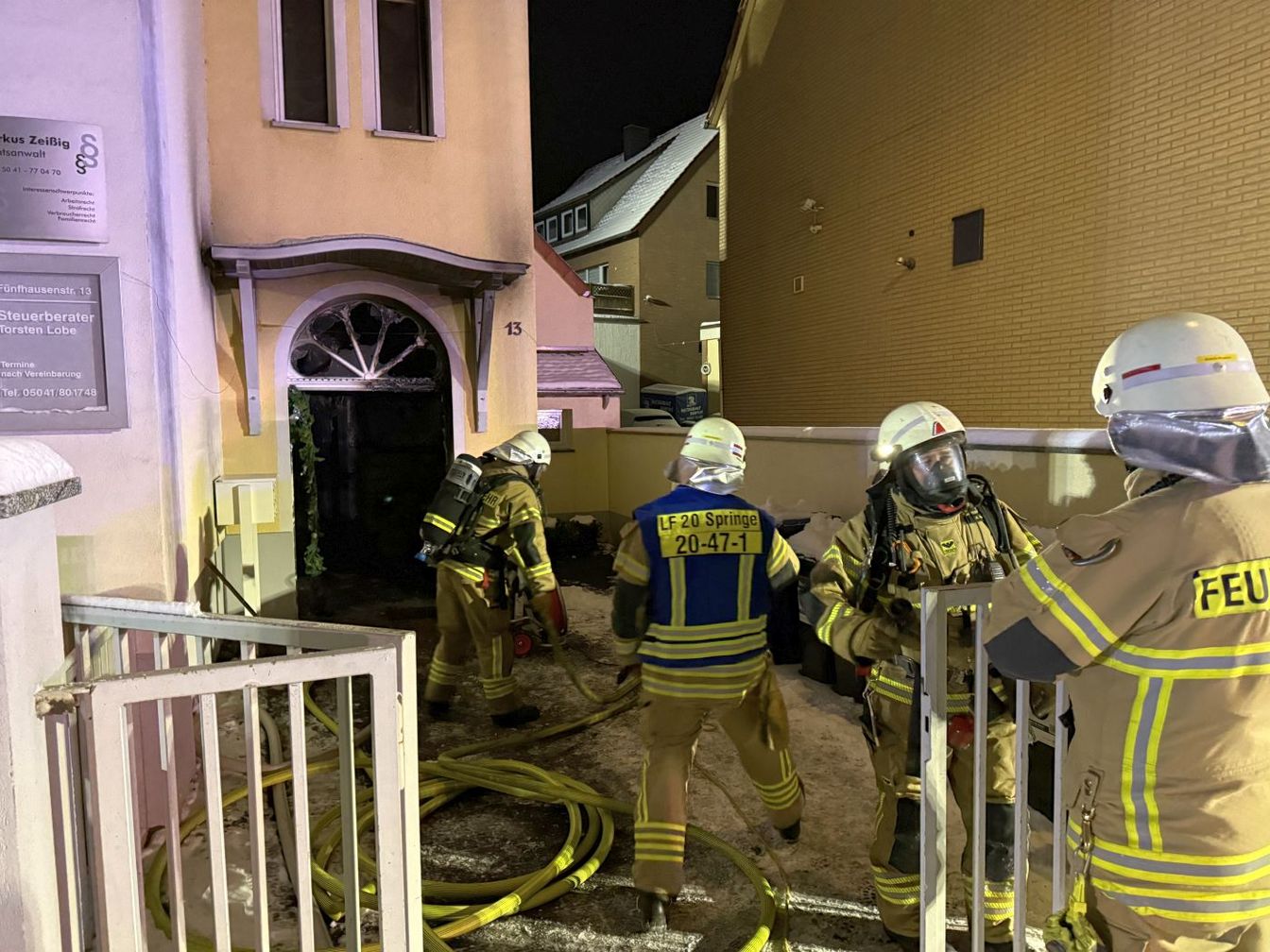 Gegen 23.30 Uhr wurden daraufhin die Freiwilligen Feuerwehren aus Springe, Gestorf, Eldagsen und Mittelrode zu einem Brand an einem Mehrfamilienhaus alarmiert. Gemeldet war ein Feuer an der Hausfassade sowie im Eingangsbereich des Gebäudes. Beim Eintreffen der Einsatzkräfte bestätigte sich die Lage. Ein Trupp unter Atemschutz löschte den Brand im Eingangsbereich.