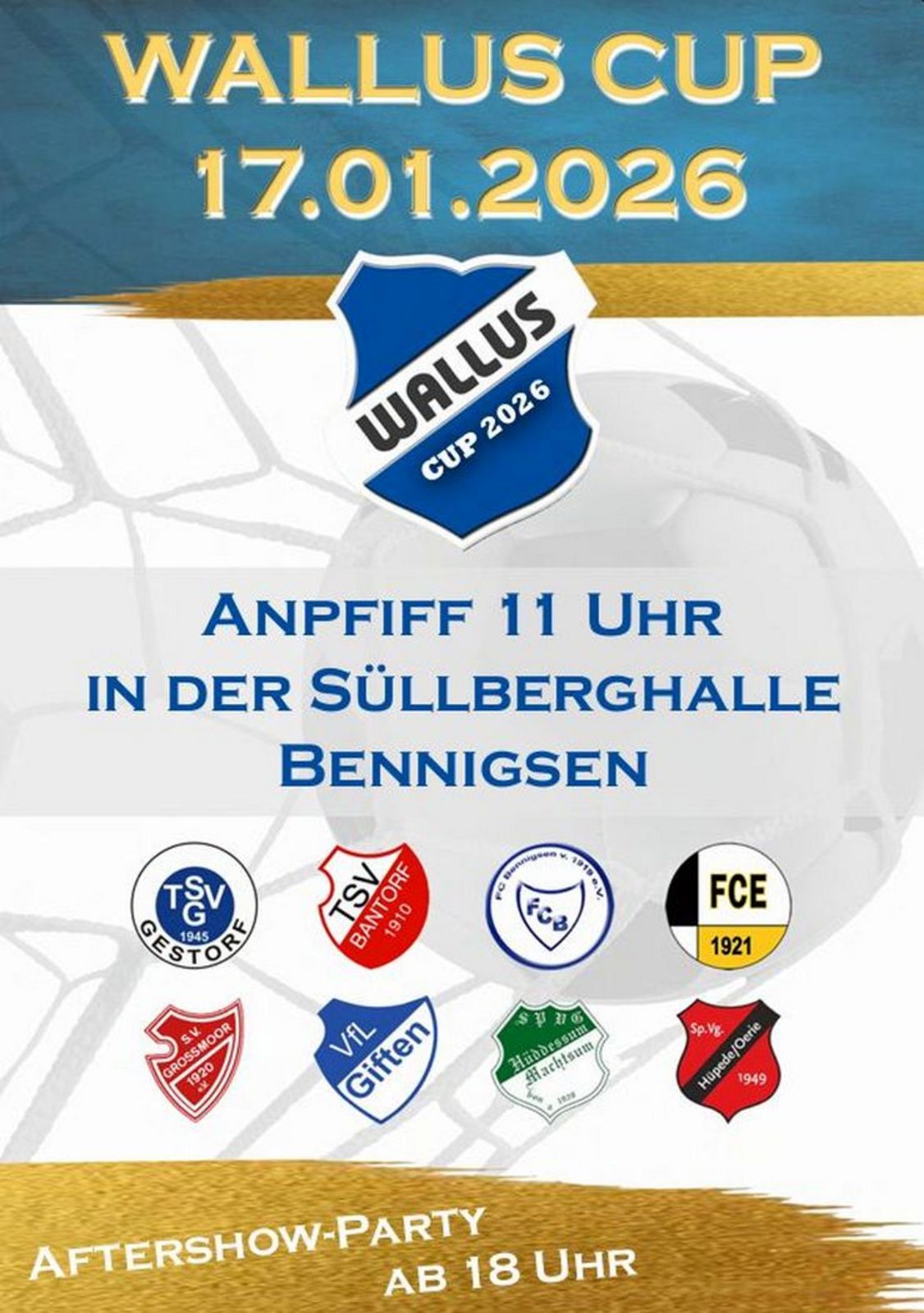 Bennigsen. Am Samstag, 17. Januar 2026, steht Bennigsen ganz im Zeichen des Hallenfußballs: Die 1. Herrenmannschaft des FC Bennigsen richtet erneut den traditionellen Wallus Cup aus. Austragungsort ist die Süllberg-Sporthalle in der Medefelder Straße, wo ab 11 Uhr spannende Spiele und sportlicher Wettkampf geboten werden.