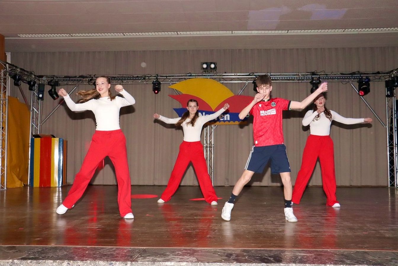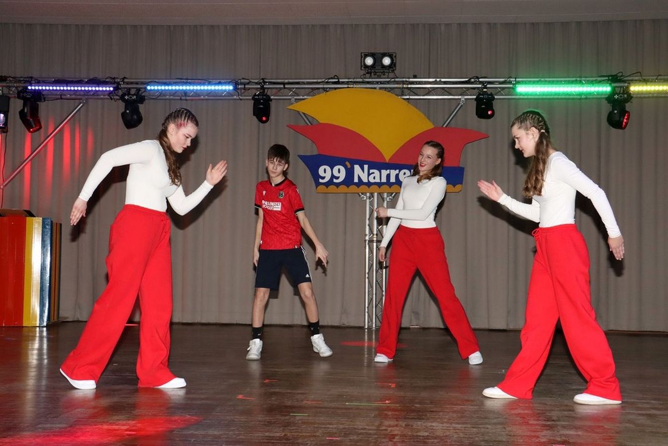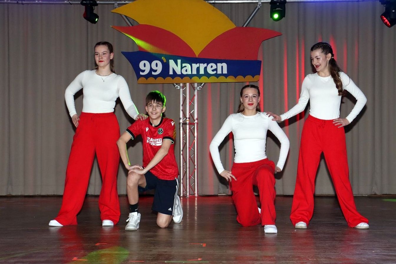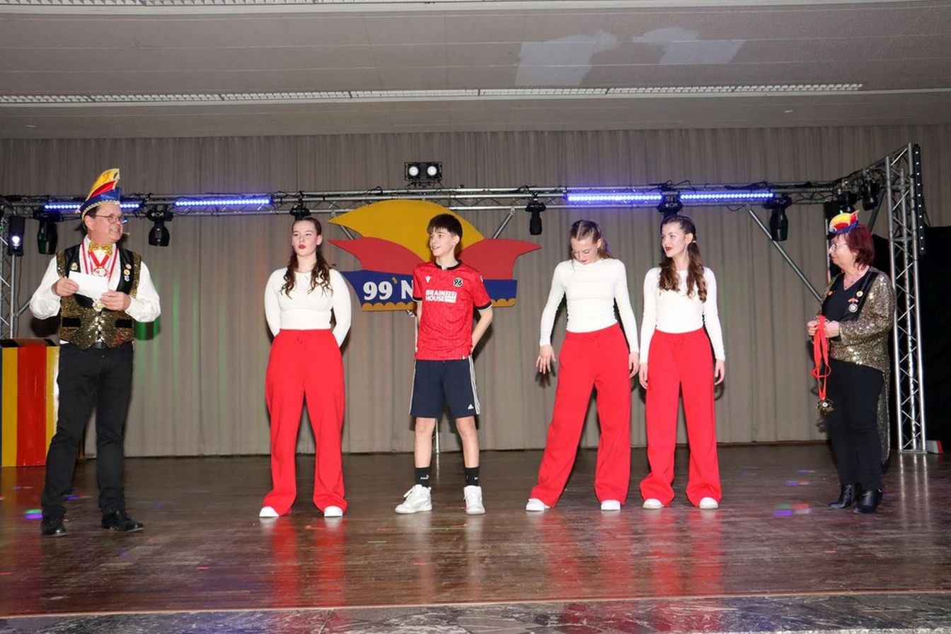 Die ausverkaufte Halle wurde von Wolfgang Pardey und Andreas Bröder begrüßt. Moderiert wurde die Karnevalsfeier erneut von Holger Heine. Auf dem Programm standen dann die Tanzmariechen aus Ricklingen und Rainer Thon als „Der Therapeut“. Besonders stolz zeigte sich der Vorsitzende Pardey über Mina Bröder und Emma Zimmer. Die beiden jungen Tänzerinnen kommen aus dem Verein und standen mit ihren eigenen Tanznummern zum ersten Mal auf der Bühne. „Sogar ihre Kostüme haben sie selbst gestaltet“, so Pardey zum Nachwuchs der ’99er Narren. Für Begeisterung sorgten auch die Tanzgruppe aus Ricklingen, die Garde aus dem Partnerverein aus Apelern.