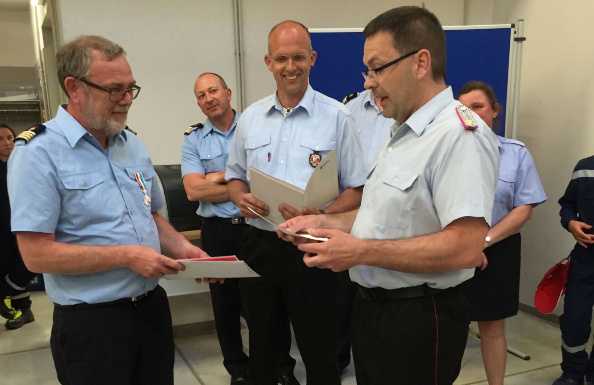 Nicht ohne Grund, denn Denis Schröder hatte die Ehre, den kürzlich in den Ruhestand getretenen ehemaligen Wehrführer von Mersch, Romain Becker, im Rahmen des anschließenden Ehrenweins mit der Ehrenmedaille für internationale Zusammenarbeit des Deutschen Feuerwehrverbandes in Silber auszuzeichnen. Damit nicht genug: Schröder ehrte auch Alain Hoffmann, Präsident im Vorstand der Feuerwehr Mersch, und seine Frau Marie-Jeanne mit der Ehrenmedaille für internationale Zusammenarbeit des Deutschen Feuerwehrverbandes. Alle drei haben sich über viele Jahre hinweg in hervorragender Weise um die Partnerschaft der beiden Feuerwehren verdient gemacht.