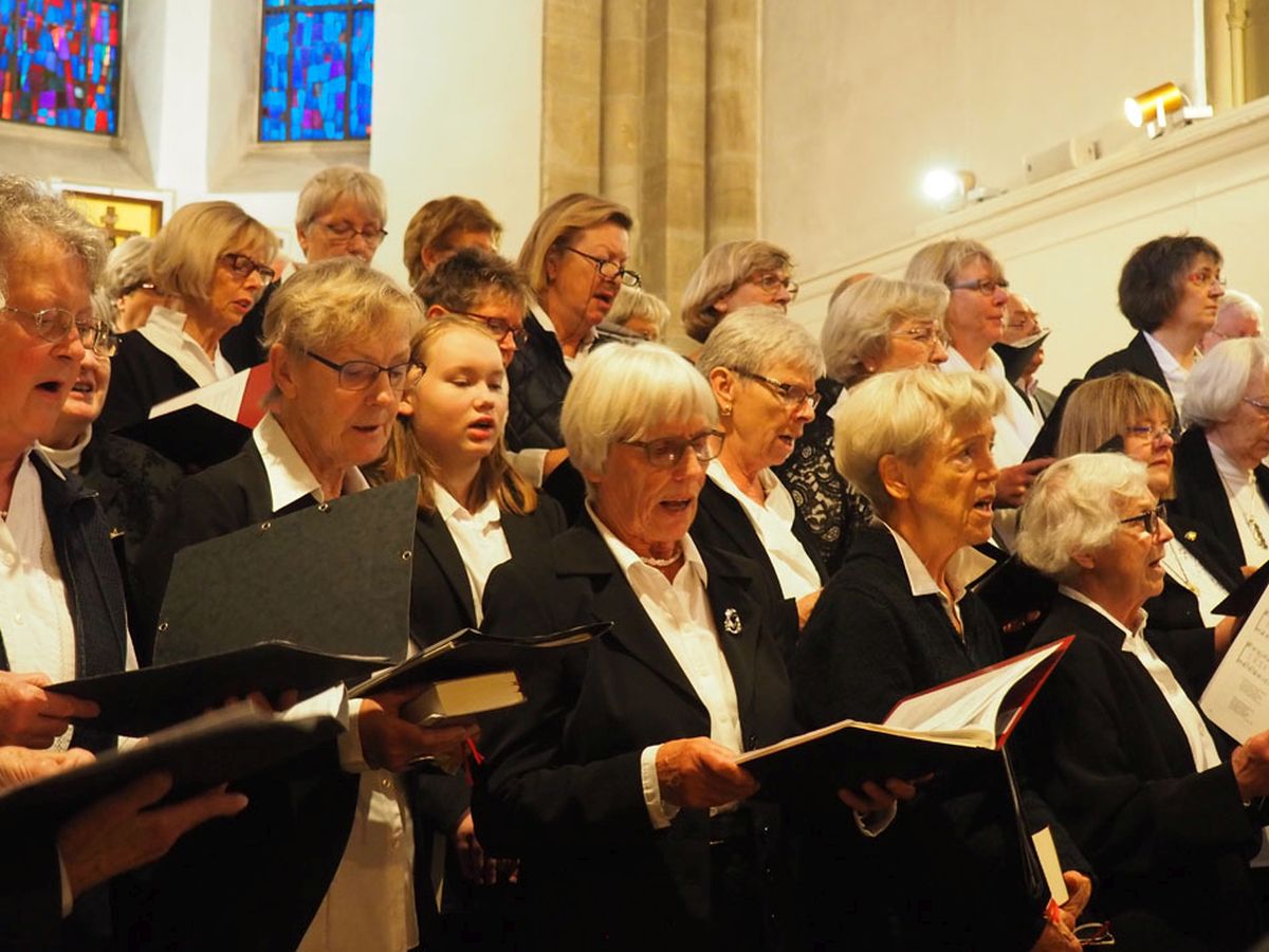 Im festlichen Gottesdienst, der von der Stadtkantorei musikalisch mitgestaltet wurde, ging Pastorin Uta Junginger in ihrer Predigt auf die Bedeutung der Musik für die Gemeinde und den Glauben ein. "Das Singen gehört zum Herzstück unserer Gemeinde, aber damit geben wir letztlich Gott die Ehre. Singen erfreut die Menschen, es tröstet und es verkündet", sagte sie. Die Kantorei habe in 100 Jahren Gemeindegeschichte geschrieben und für viele der Sängerinne und Sänger gehöre der Chor zur Lebensgeschichte dazu. Damit ist der Chor auch eine "Weg- und Trostgemeinschaft" - und habe auch durch die Begegnungen mit der Kantorei in der sächsischen Partnergemeinde Waldheim deutsch-deutsche Geschichte mitgestaltet und über Landesgrenzen hinweg zu einem englischen Chor Kontakte gepflegt.
