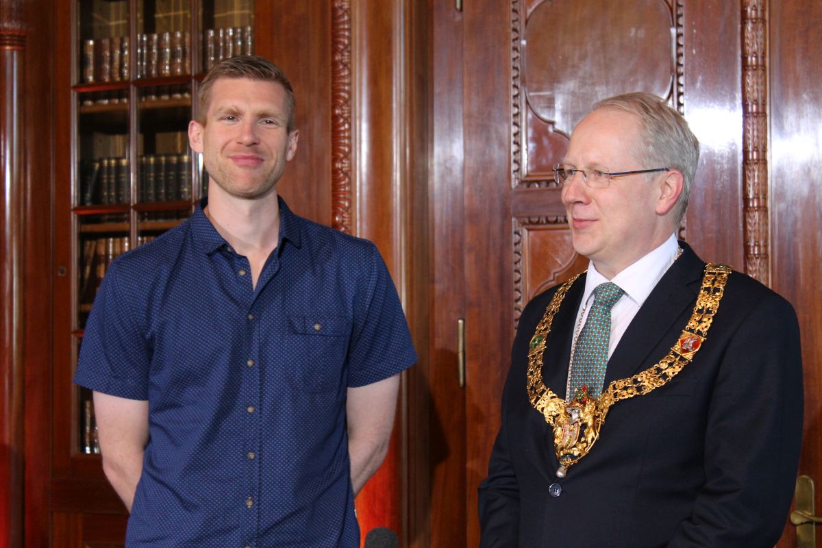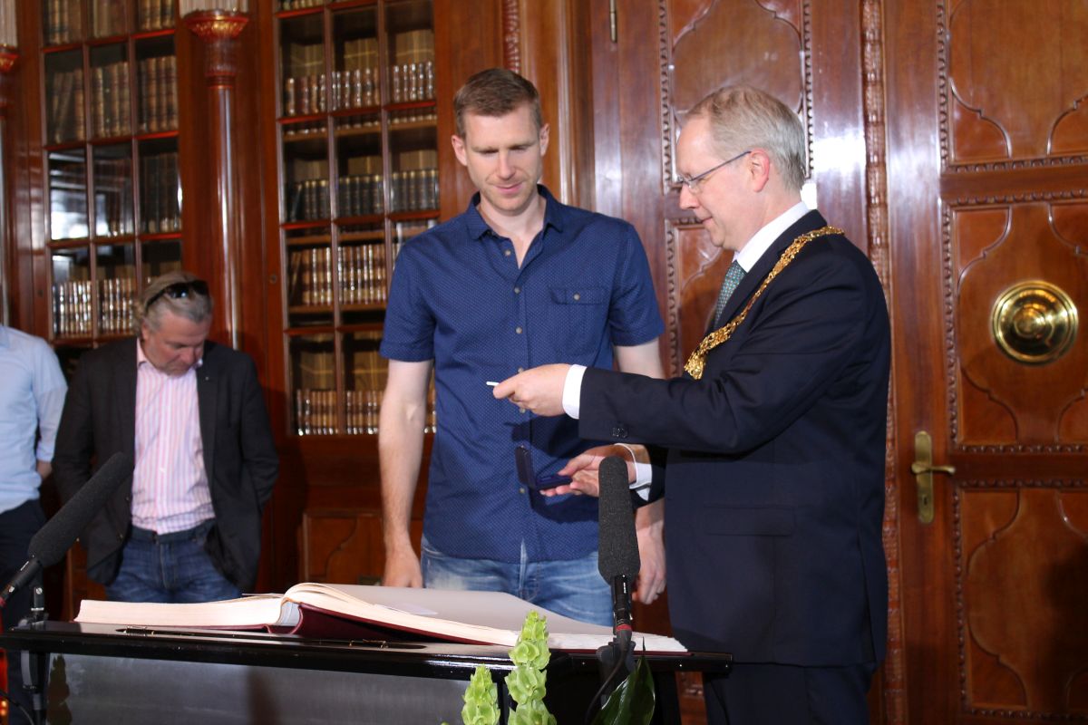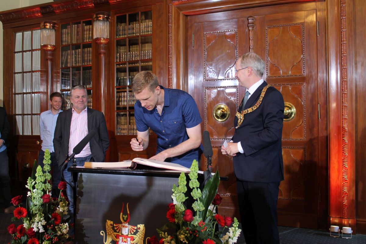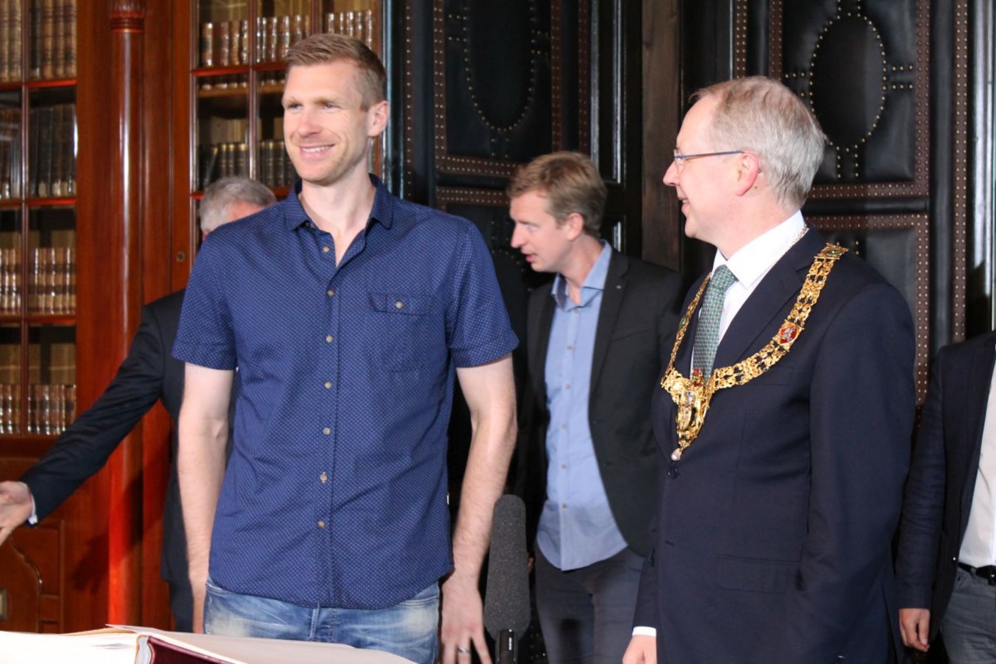 Etwas verspätet erschien Per Mertesacker heute in der Ratstube im neuen Rathaus, um sich in das Goldene Buch der Stadt einzutragen. Bürgermeister Schostok leitete das Ereignis mit einer feierlichen Rede ein und betonte besonders Mertesackers Verbundenheit mit der Region und der Stadt Hannover.