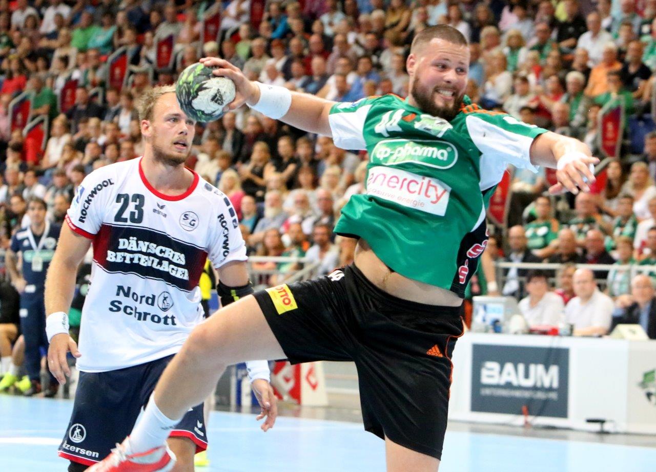 Über die Mitte der Deckung gab es kein Durchkommen und nach Ballgewinn ging die Post ab. Die Recken spielten den Flensburger Hochgeschwindigkeitshandball und erhöhten auf 10:7 (14.). Fast jeder Wurf war ein Treffer und nachdem Evgeni Pevnov die Kugel ins verwaiste Flensburger Tor beförderte, leuchtete eine 18:11-Führung (24.) vom neu installierten Video-Würfel.