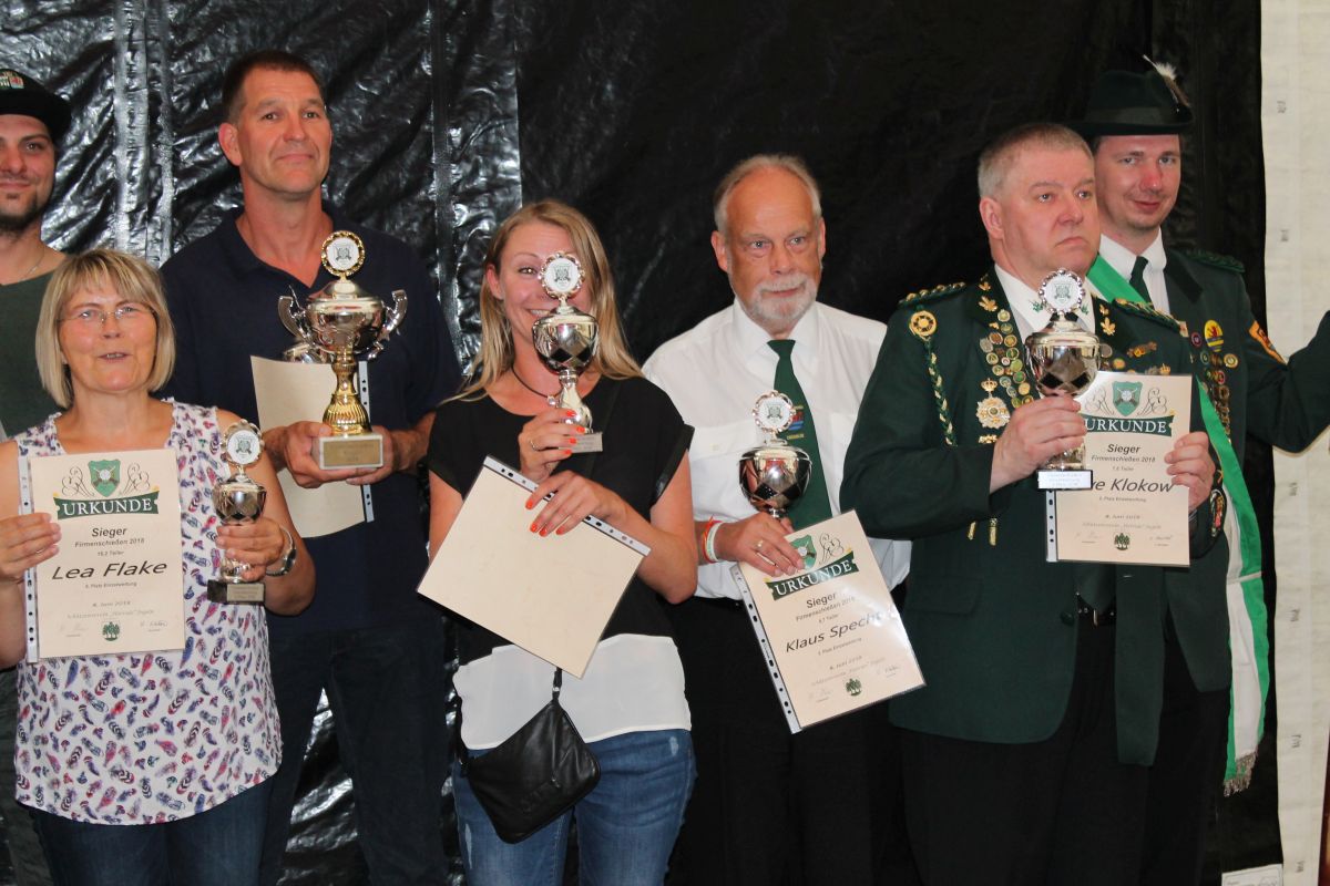 Riesen Jubel bei der Mannschaft der Freiwilligen Feuerwehr Ingeln-Oesselse: Erster Platz im Gruppenwettbewerb! Kostya Sikorski holte den Pokal im Einzelwettbewerb. Die über die Ortsgrenzen hinaus bekannte Junggesellschaft Ingeln-Oesselse schaffte es zwar nicht auf die vorderen "Schießplätze", verdient aber ganz sicher einen Pokal für das Verbreiten guter Laune und perfekter Stimmung.