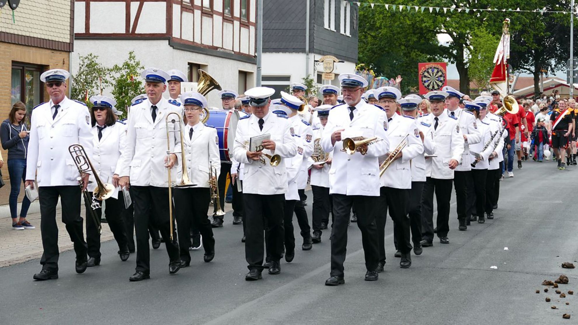 Um ein paar von denen wieder loszuwerden, hatten alle Teilnehmer des großen Festumzuges um 15 Uhr Aufstellung bezogen. Und dann ging es los. Pünktlich um 15.30 Uhr hieß es: marschieren, marschieren, marschieren. Nach diesen angenehmen Strapazen trafen sich alle Kapellen im Festzelt, wo sie ab 17 Uhr gemeinsam mit den vielen Besuchern Musik präsentierten, die sofort zum Mitsingen einlud.
