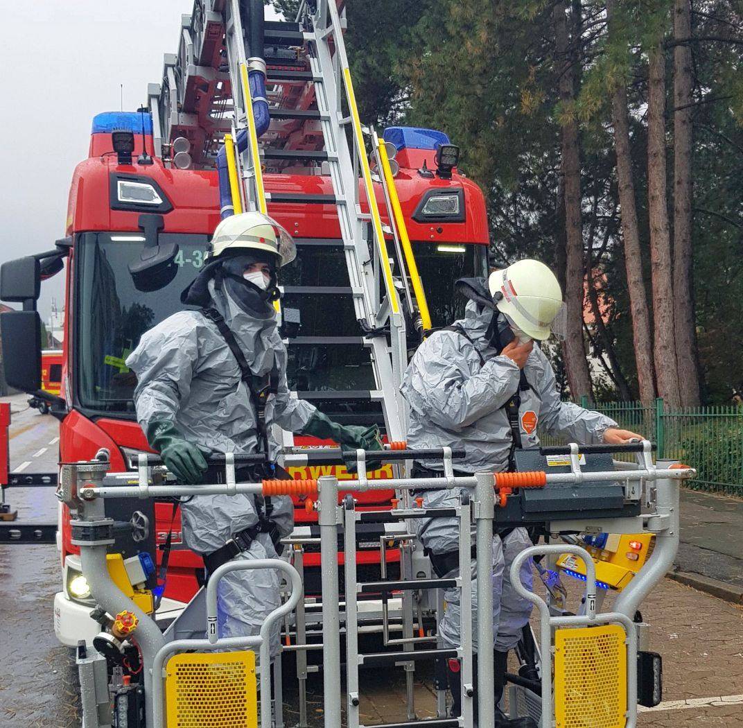 Die Polizei informierte nach einer Halterabfrage die Besitzer zweier Pkw, die ihre Fahrzeuge schnell aus dem Gefahrenbereich entfernen konnten. Mit der Drehleiter kontrollierte die Feuerwehr anschließend weitere Platten und sicherte lose Stellen mit Schrauben. Da es sich möglicherweise um asbesthaltige Produkte handelte, arbeiteten die Einsatzkräfte in spezieller Schutzausrüstung mit Einmalanzügen, Handschuhen, Masken und Gummistiefeln. Die beschädigte Platte wurde von einem Hausmeisterservice aufgenommen und fachgerecht entsorgt. Während der Arbeiten musste die Rehrbrinkstraße voll gesperrt werden. Einsatzende war um 9:50 Uhr.