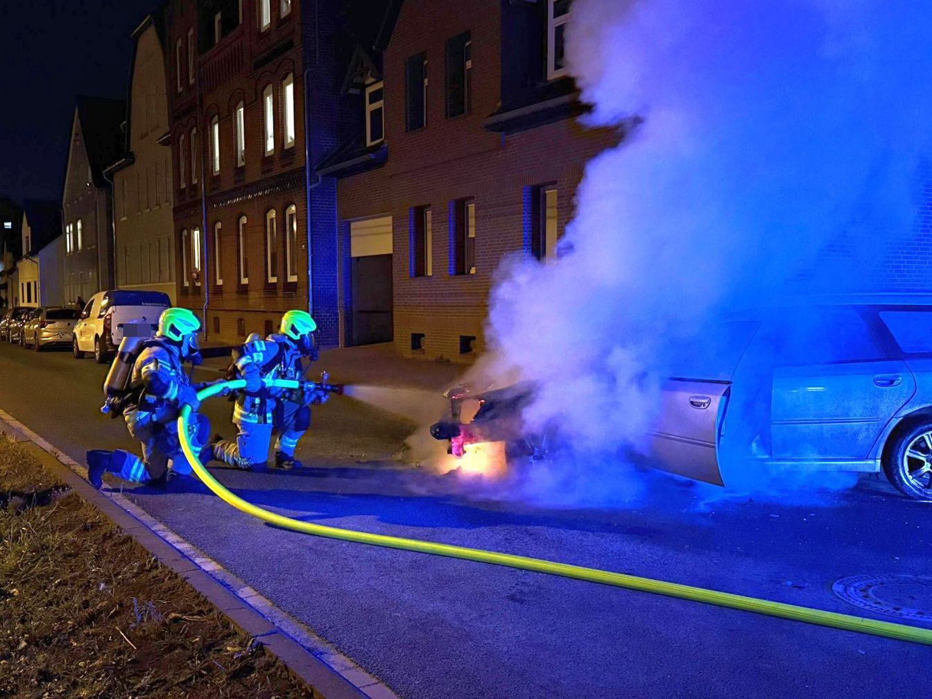 Nachdem dieses misslang, rief er um 20.25 Uhr die Ortsfeuerwehr Laatzen zu Hilfe, welche unverzüglich mit drei Fahrzeugen und 21 Einsatzkräften ausrückte. Vor Ort kühlten die Retter unter Atemschutz den in Brand stehenden Motorbereich mit Wasser herunter, bevor die Flammen mit Schaum vollends erstickt werden konnten. Im Anschluss wurde der Bereich mit der Wärmebildkamera kontrolliert und das Fahrzeug dem Eigentümer übergeben.