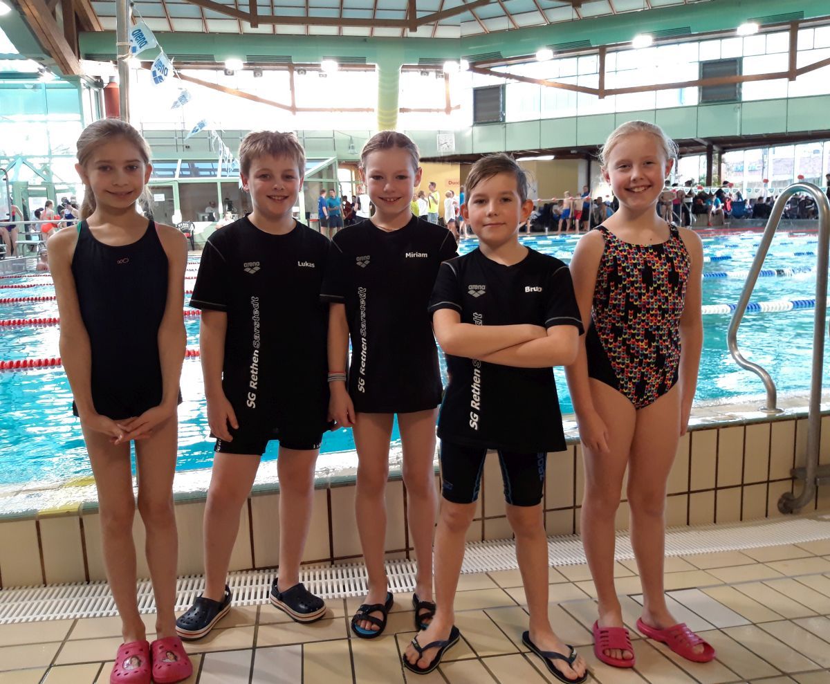 Am Samstag, 1. und Sonntag, 2. Dezember, fand im Wasserparadies Hildesheim der Landesentscheid des deutschen Mannschaftswettbewerbs (DMSJ) und Staffelvergleich Jugend E 2018 statt. Hierfür hat sich die SG RethenSarstedt mit der Mixed-Staffel 2009/10 auf dem DMSJ-Bezirksentscheid am 28. Oktober, qualifiziert. Sie trat mit weiteren sieben Mannschaften des Landesschwimmverbandes Niedersachsen über jeweils vier mal 50 Meter Freistil, Brust, Rücken und Lagen in Hildesheim an. Insgesamt stellten 25 Vereine beziehungsweise Startgemeinschaften die Aktiven für 384 Staffelstarts, wobei die SG RethenSarstedt mit unterschiedlicher Besetzung durch Maja Augustyniak, Antonia Breitkopf, Lukas Maximilian Fahrion, Titus André Kossler, Miriam Limmer und Bruno Wissel am Wettkampf teilnahmen. Die SG RethenSarstedt konnte in diesen jungen Jahrgängen erfreulicher Weise eine Staffel zusammenstellen, in der auch wenig routinierte Wettkampfschwimmerinnen vertreten waren und somit die tolle Chance bekamen, ihr Talent unter Beweis stellen konnten. In vier mal 50 Meter Brust und Lagen erreichten sie jeweils den siebten Platz. In vier mal 50 Meter Freistil und Rücken reichte es je nur für den achten Platz, wobei die Freistil-Staffel nur knapp den siebten Platz verfehlte. In der Gesamtwertung schafften es die Schwimmer nur auf den insgesamt achten Platz, jedoch mit persönlichen Bestzeiten und vielen Wettkampfeindrücken. Die Mannschaft konnten mit der Gewissheit zufrieden nach Hause fahren, achtbeste Mixed-Mannschaft (Jahrgang 2009/10) im Landesschwimmverband Niedersachsen zu sein.