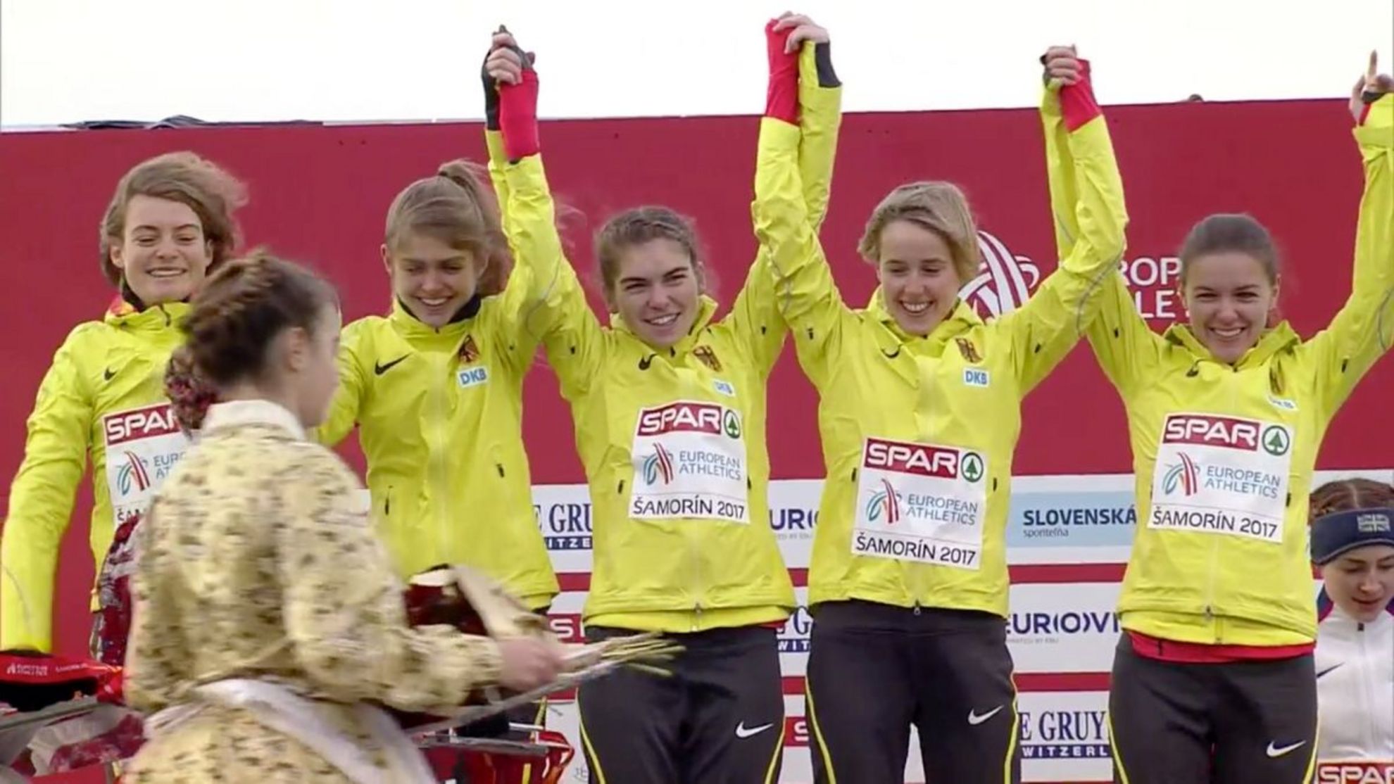 Abb. 2: Zum Sturm bei der Europameisterschaft der stürmische Jubel der deutschen U23-Frauen: Alina Reh, Konstanze Klosterhalfen, Vera Coutellier, Anna Gehring und Svenja Pingpank (vlnr)