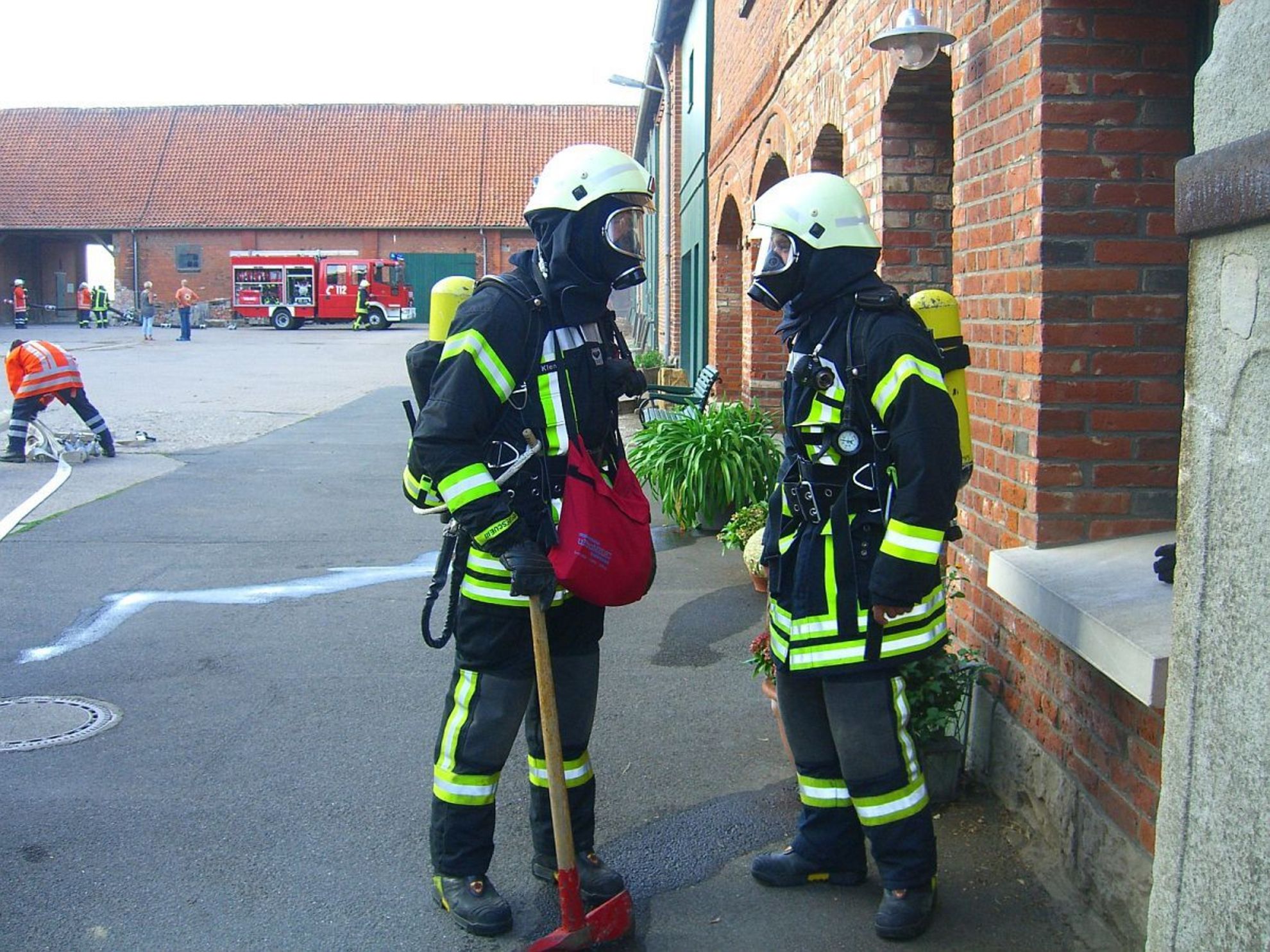 Sekundär wurde die Brandbekämpfung auf dem gesamten Gelände des landwirtschaftlichen Betriebes simuliert, es kamen vier Strahlrohre zum Einsatz. Die Löschwasserversorgung wurde zum Einen aus dem öffentlichen Hydrantennetz und zum Anderen durch einen Löschwasserbrunnen auf dem Betriebsgelände sichergestellt.